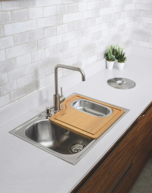Cuba de sobreponer Tramontina de acero inoxidable con terminación satinada, 69 x 49 cm, con basurero de embutir de 5 l de capacidad, tabla de madera, dosificador de jabón, canasto colador y válvula.