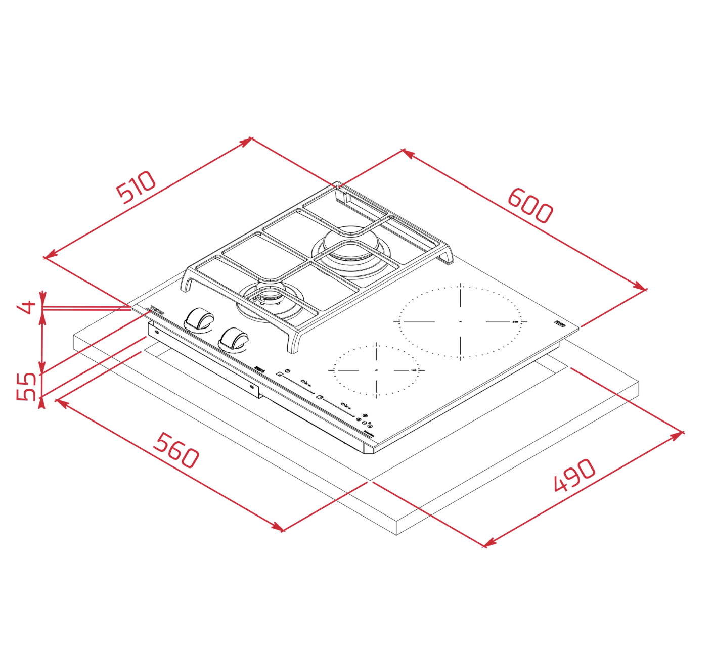 - Exterior (Alto/Ancho/Fondo): 55/600/510 mm